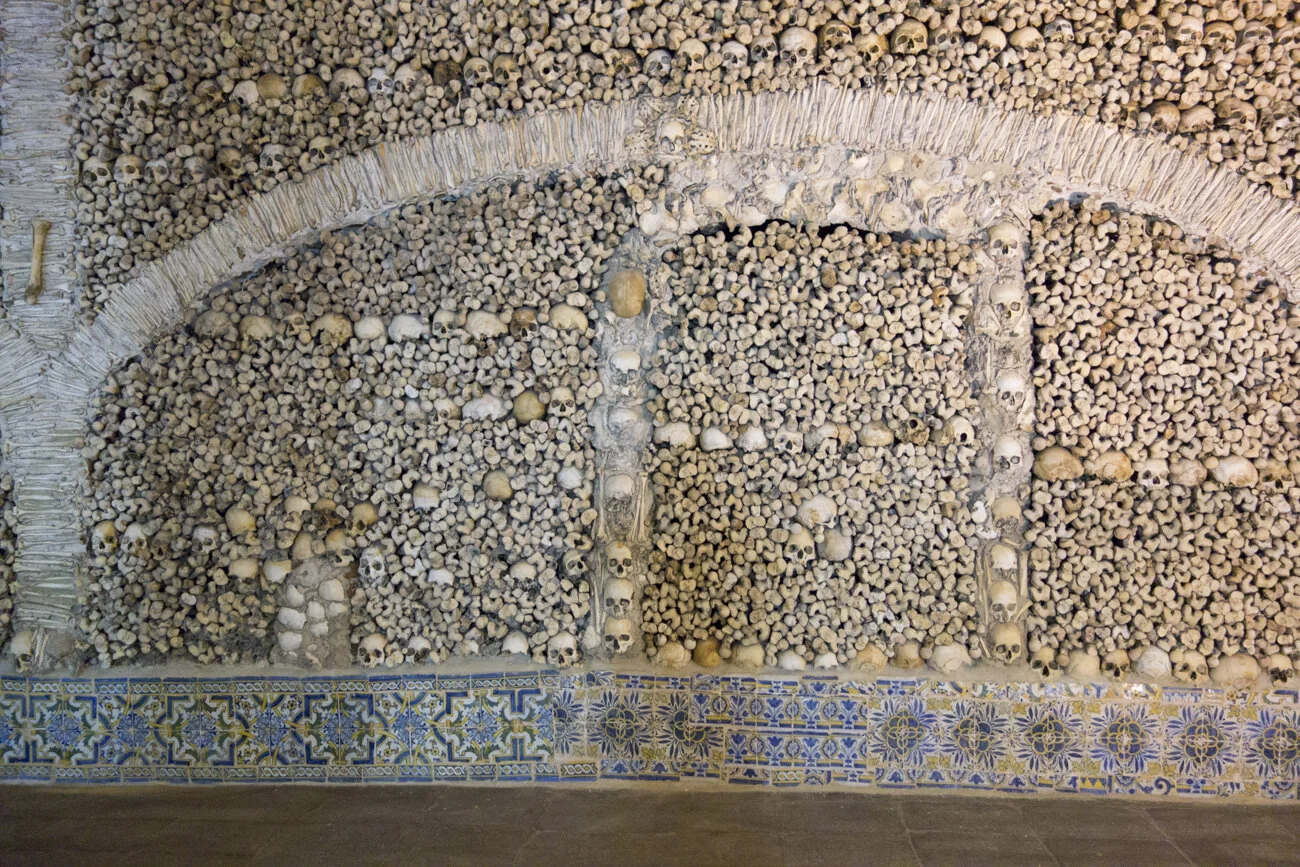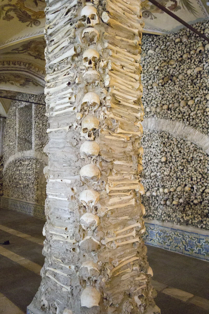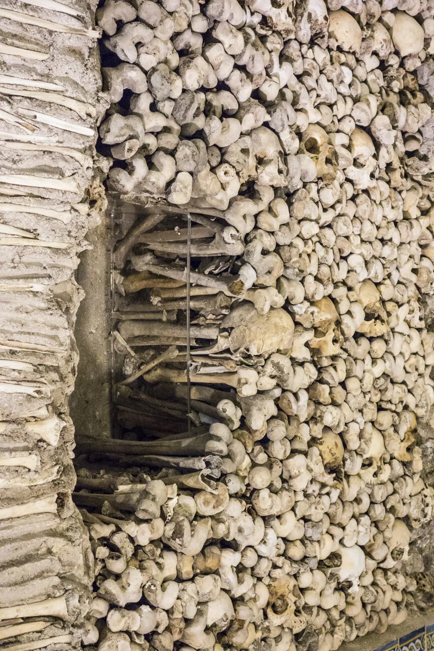 Just around the corner from the front of St. Francis church is the entrance to Capela dos Ossos, aka the Chapel of Bones. The macabre greeting on the wall states “we bones, lying here, for yours we wait”. It’s a surreal experience to see the remains of bodies dug up from the town graves in the 17th century used to create a place of worship and reflection, but you can’t help but appreciate the artistry and dedication that went into it.