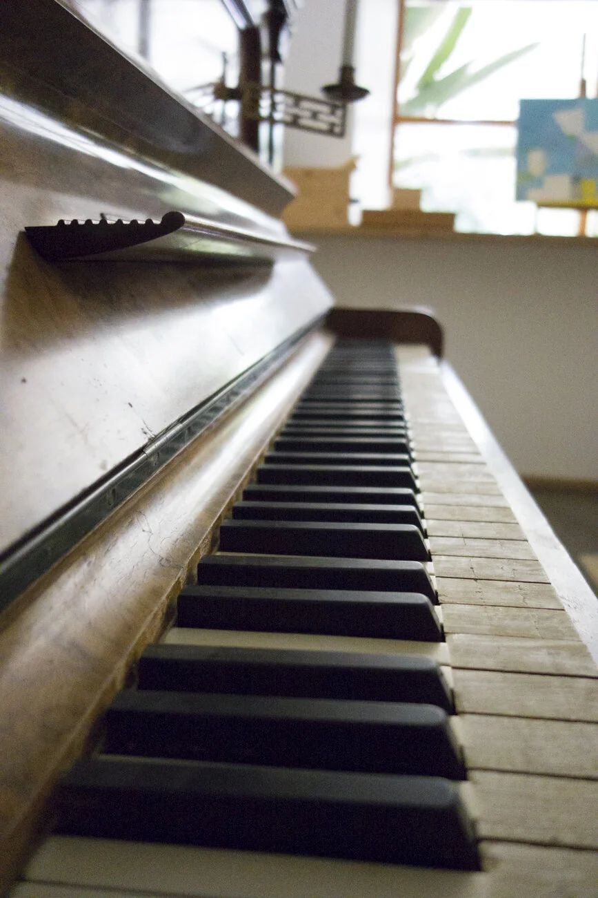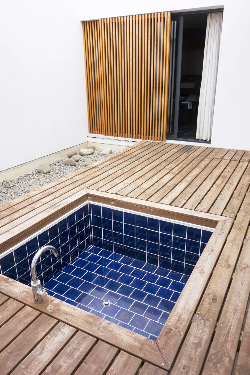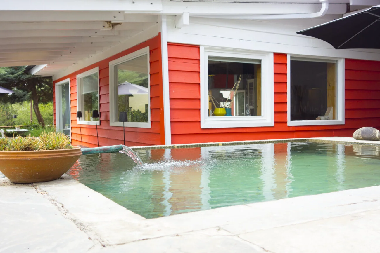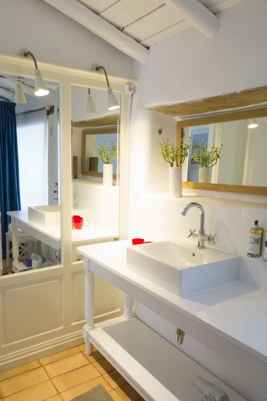 The overall decor is farmhouse chic. They’ve found ways to infuse colorful modern art and pops of color with comfy style into all of the shared community spaces. Our room, #14, was one of their “Romantic Rooms” at $149/night—the crisp white bedding and walls contrasting beautifully with the exposed wooden ceiling beams. Our bathroom was nice and large with good natural light, overlooking the pool.