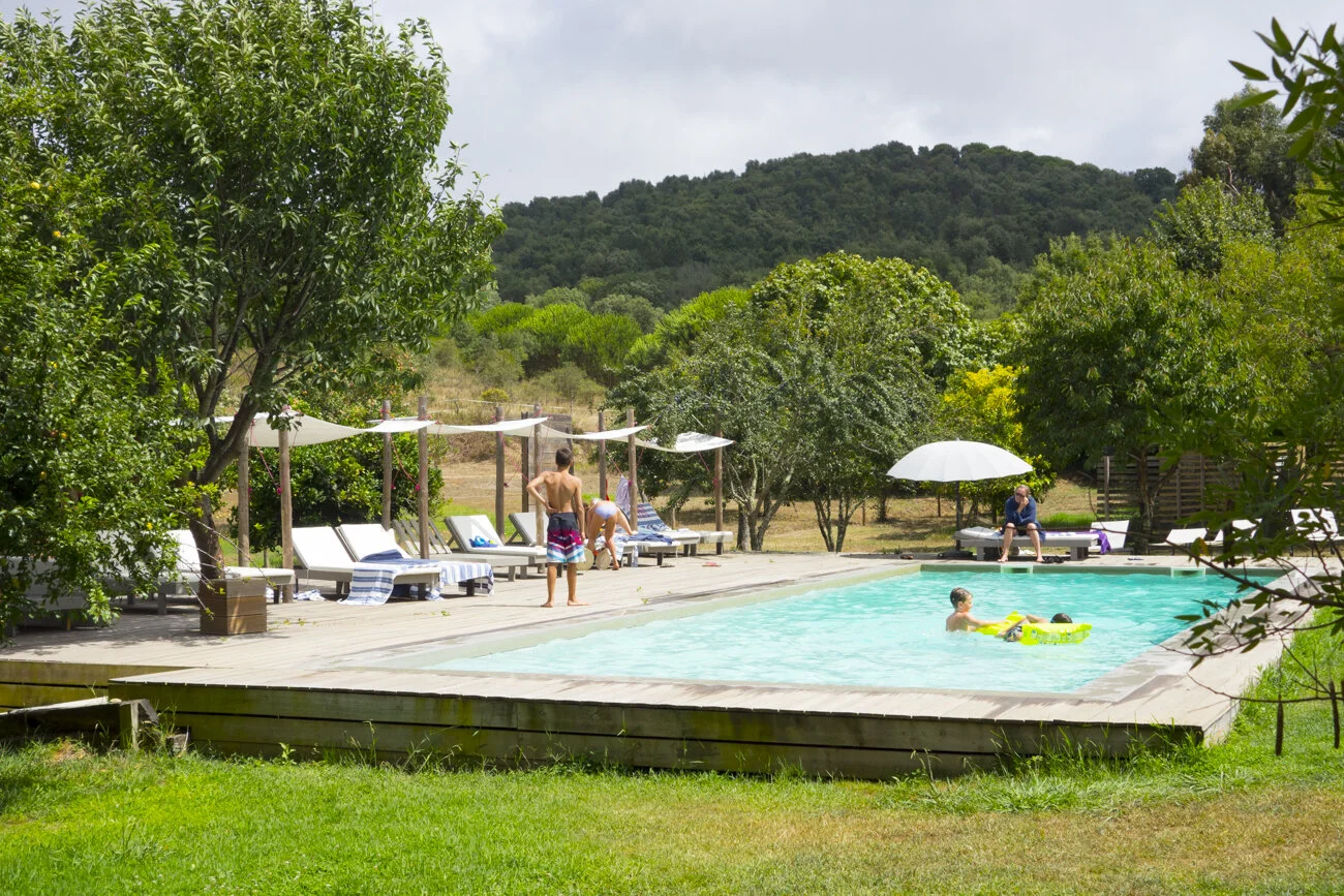 Rota Vicentina is a network of walking trails along the Southwest coast of Portugal, totaling 400 km, along the most beautiful and best preserved coastline of Southern Europe. There are 75+ small hotels and inns featured on the site that line the trail, which is how we found Herdade da Matinha (these places get totally booked up during the summer beach season, so book several months in advance if that’s when you plan to travel). There’s an entrance to the trail right from the Herdade da Matinha property, although Matinha is a bit inland, so we were told it was a 2hr hike just to reach the coastline via the trail. We hiked about an hour in and then turned around because while there were some shaded sections, it was a bit too hot to make it the all the way to the coast on that particular day (and poolside mojitos were calling our name). But we really enjoyed the mix of cork trees, blue skies, and lush pockets of wooded areas along the way.
