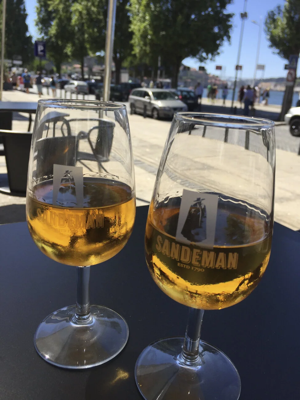 Across the Douro River from Port, stretched along the hillside on the south bank, is where all of the port houses are. They all offer tours and tastings, but we were content to just sit ourselves down outside the Sandeman house, sipping our port, listening to a street musician play beautifully on his violin, and people-watch for a couple hours. Plus, the view of Porto from this side is fabulous.